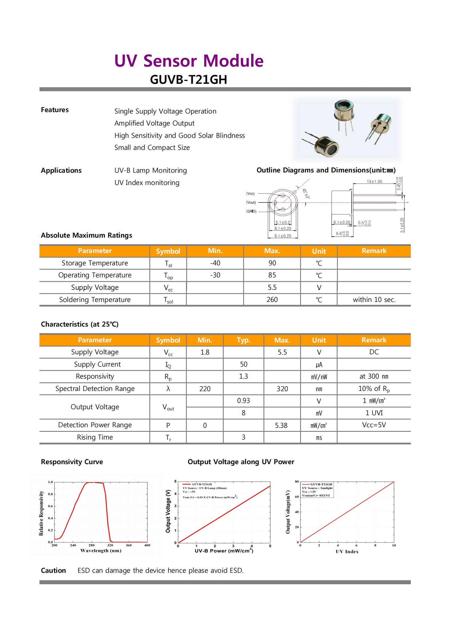 二、紫外線傳感器GUVB-T21GH特性: